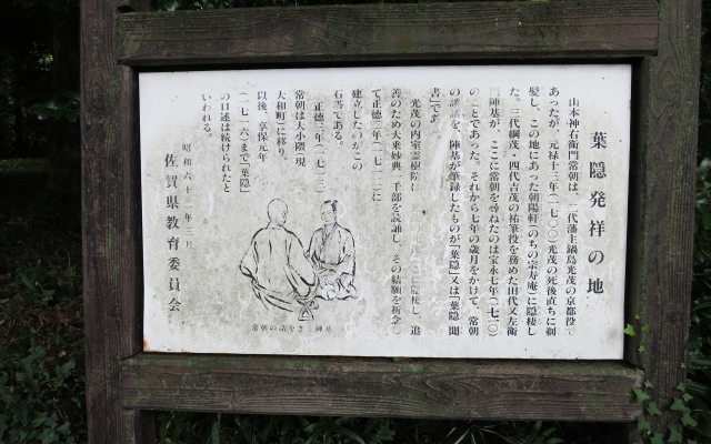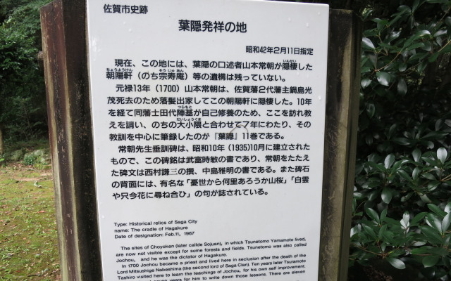 元禄13年(1700)山本常朝は、佐賀藩2代藩主鍋島光茂死去のため落髪出家してこの朝陽軒(のち宗寿庵)に隠棲した。10年を経て同藩士田代陣基(つらもと)が自已修養のため、ここを訪れ教えを請い、のちの大小隈(だいしょうくま)での口述と合せて7年にわたり、その教訓を中心に筆録したのが葉隠11巻。