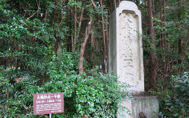 二代佐賀藩主鍋島光茂に仕えた山本常朝は、光茂が没した元禄13年(1700年)に、金立町に隠棲。同藩士田代陣基が常朝を訪れ武士の心構えや生き方などを聞き、これを筆録したものが「葉隠」。その傍らに光茂夫人が亡夫追善のため建立した千部経塔が建っています。その東側には常朝の偉業を偲び「常朝先生垂訓碑」が建立されています。