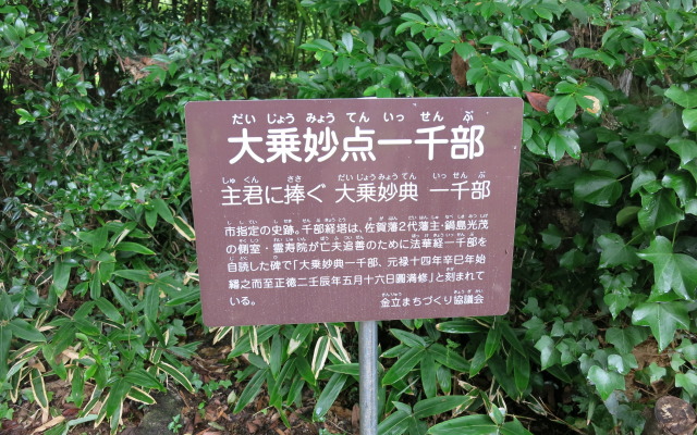千部経塔は、佐賀藩2代藩主鍋島光茂の夫人が亡夫追善のために法華経一千部を自読した碑で「大乗妙典一千部、元禄十四年辛巳年始繙之而至正徳二壬辰年五月十六日圓満修」と刻まれている。