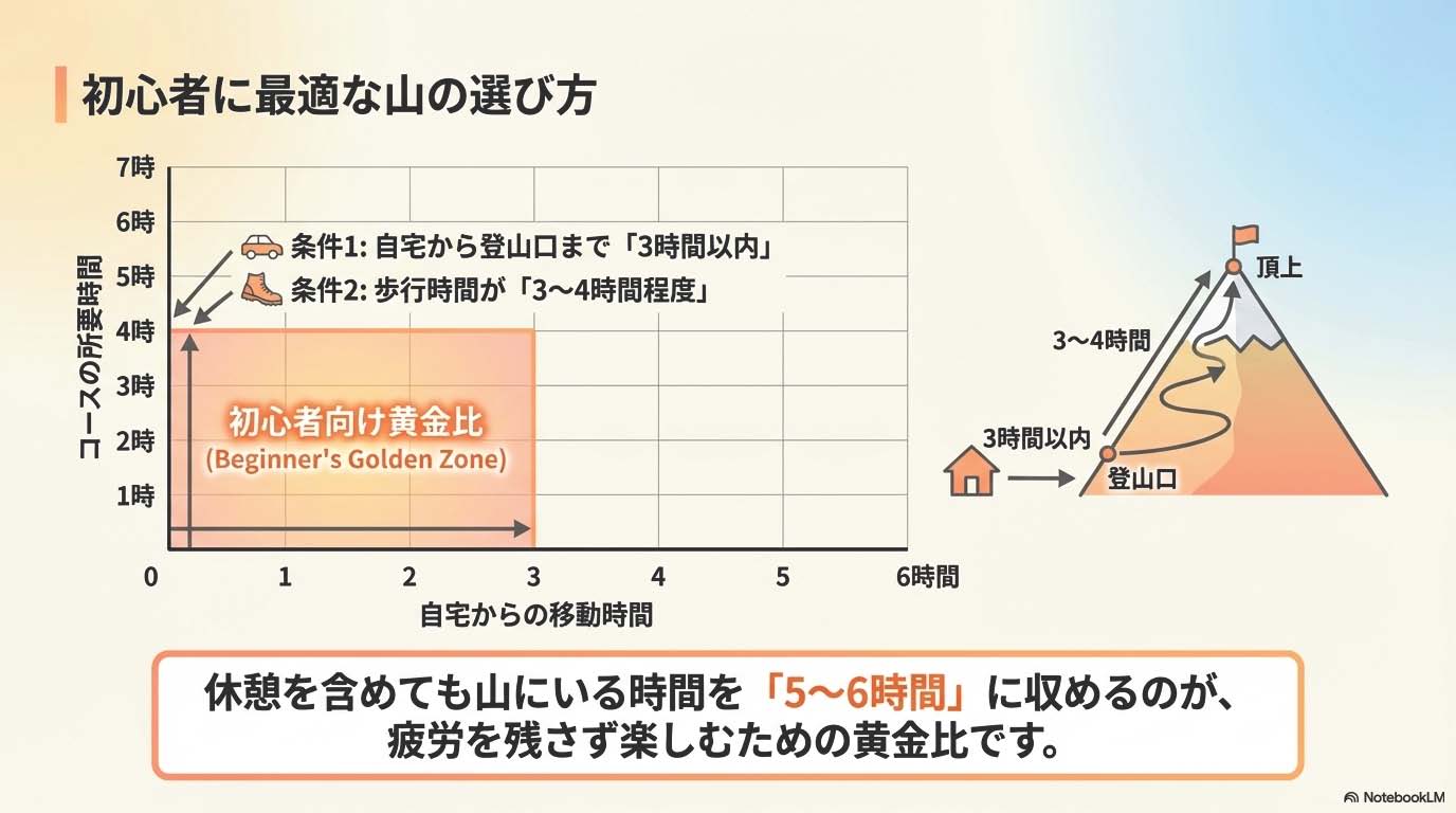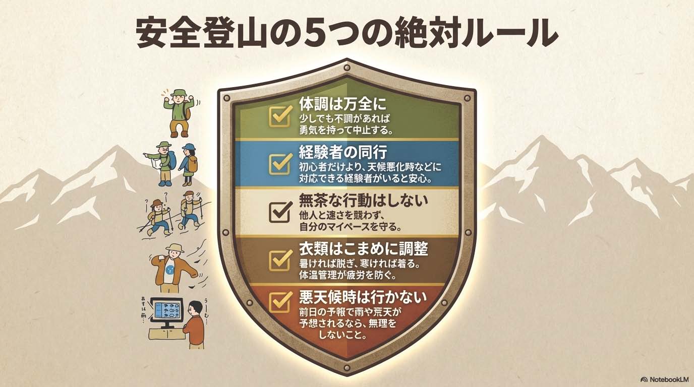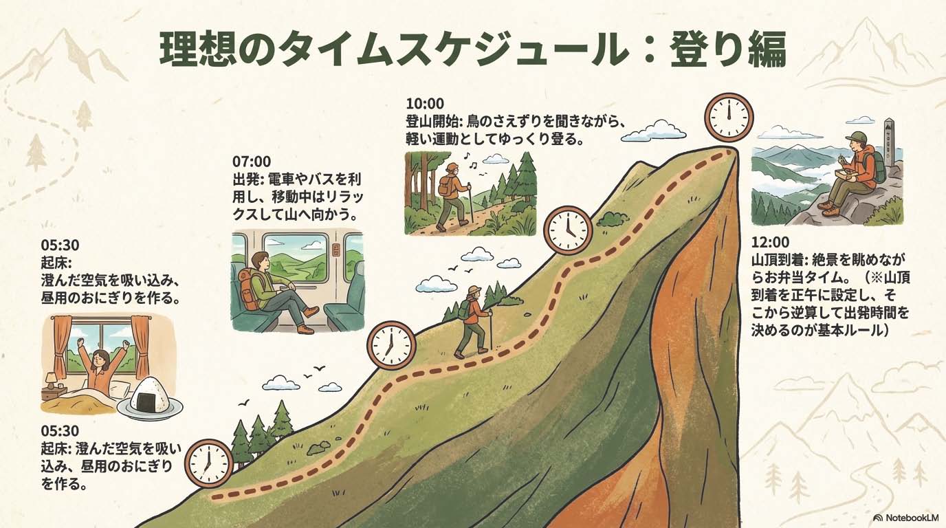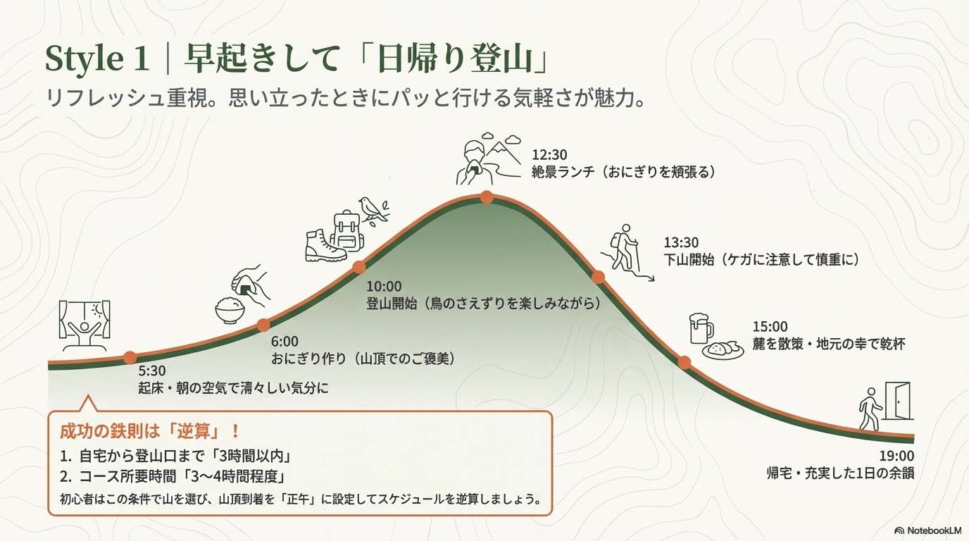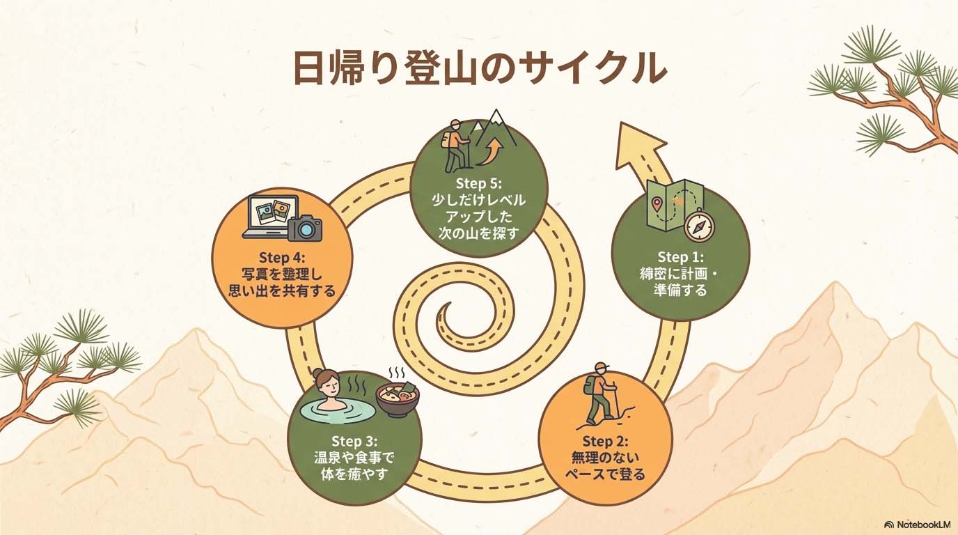 日帰り登山を計画する際、特に重要なポイントは「無理のない山選び」と「逆算でのスケジュール作成」です。主なポイントを以下にまとめました。