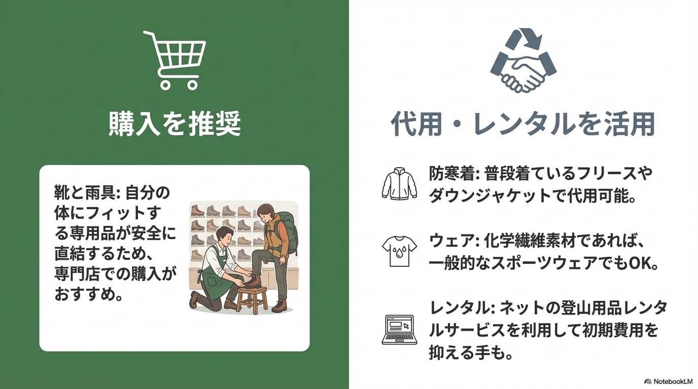 ビニール製の雨具は汗で内側が蒸れてしまうため、山には適していません。雨の浸入を防ぎつつ、内側の蒸れを外に逃がしてくれる「透湿防水素材」のものがおすすめです。