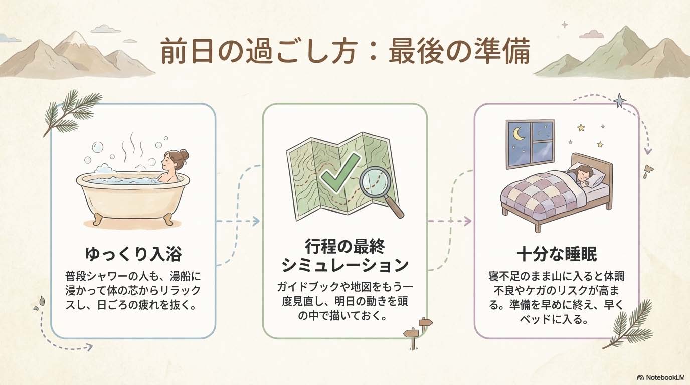 計画を立てて準備が終わったら、前日はお風呂にゆっくり浸かって疲れをとり、早めに就寝して万全の体調で当日に臨むことが大切です。