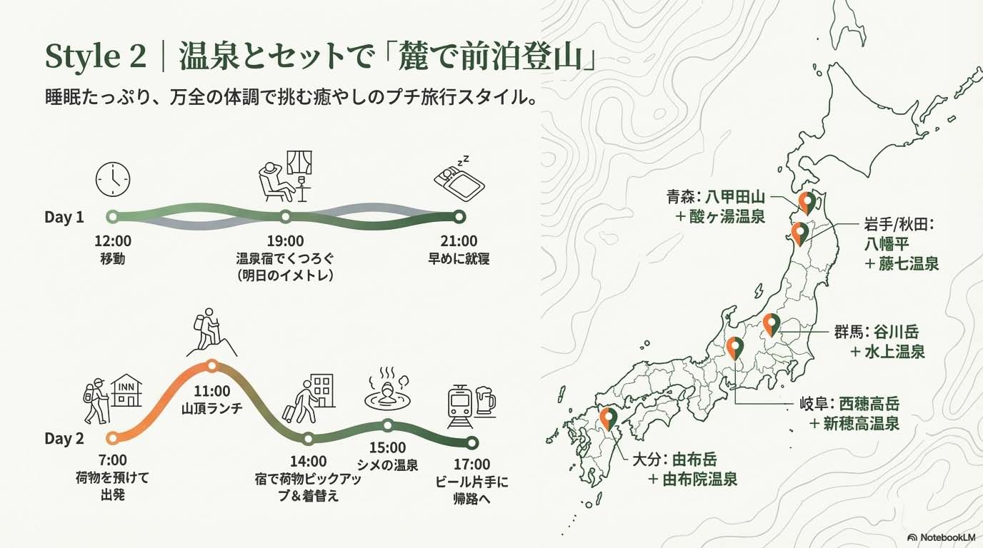 時間とお金に余裕がある場合、登山口に近い温泉宿などで前泊するスタイルです。睡眠時間をたっぷりとれて万全の状態で登山に臨めるだけでなく、温泉郷でのんびりしたり、周辺観光を楽しんだりできるメリットがあります。