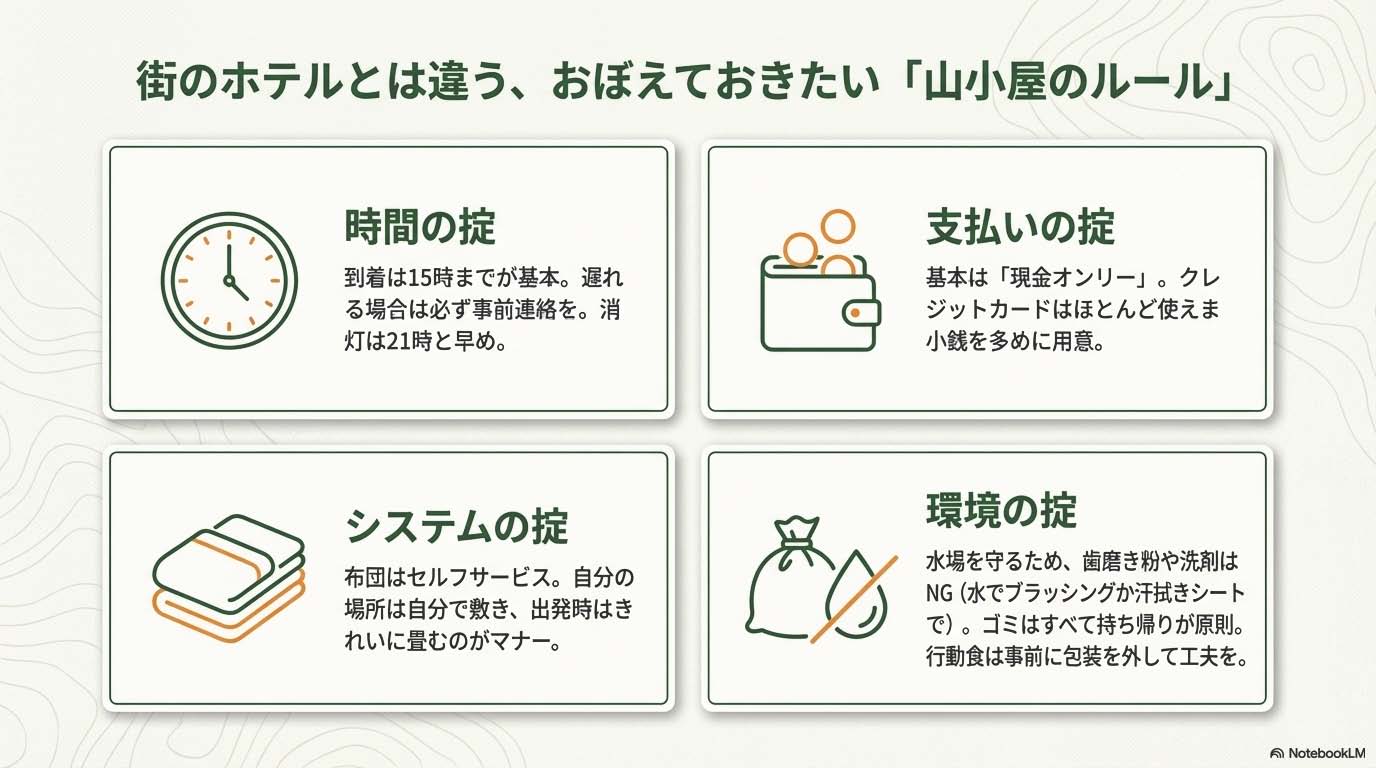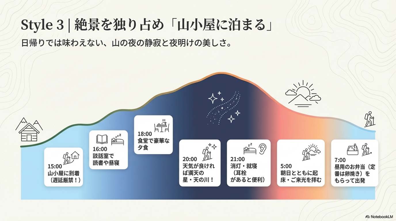 日帰りでは味わえない、夜の満天の星空や朝焼けの太陽など、自然の美しさを心から感じられるスタイルです。ただし、15時までに到着する、消灯時間を守る、支払いは現金のみ、ゴミは持ち帰るなど、山小屋ならではのルールを事前に把握しておく必要があります。