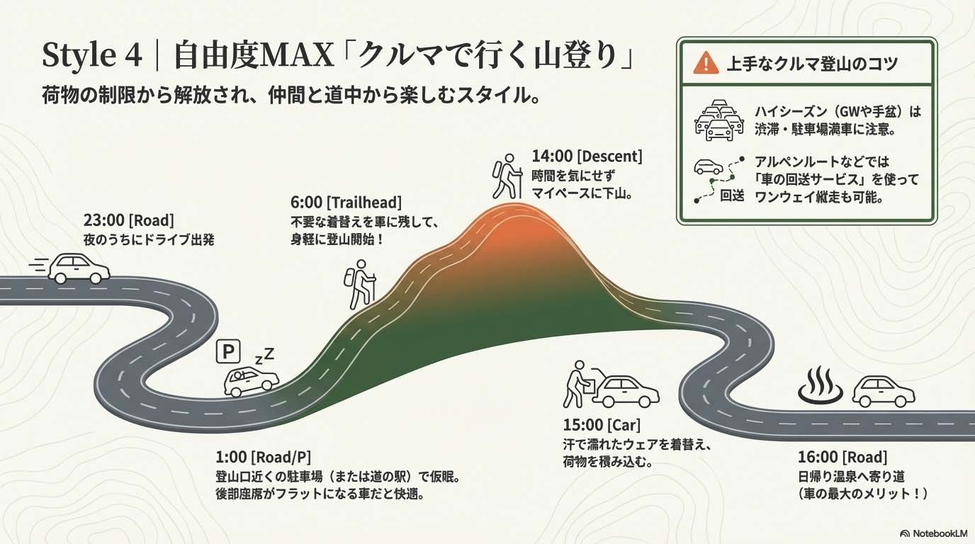 電車やバスのように時刻表に左右されず、スケジュールにフレキシブルに対応できるスタイルです。荷物が多くても移動が快適で、駐車場での仮眠や、下山後の着替えを車に置いておけるなど、登山における自由度がさらに広がります。
