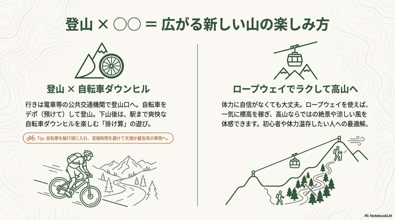 登山と自転車の趣味を同時に満たすコラボスタイルです。公共交通機関を使って自転車を運び(輪行)、登山口に駐輪して登山を楽しんだ後、帰りは駅まで自転車での爽快なダウンヒルを楽しむことができます。