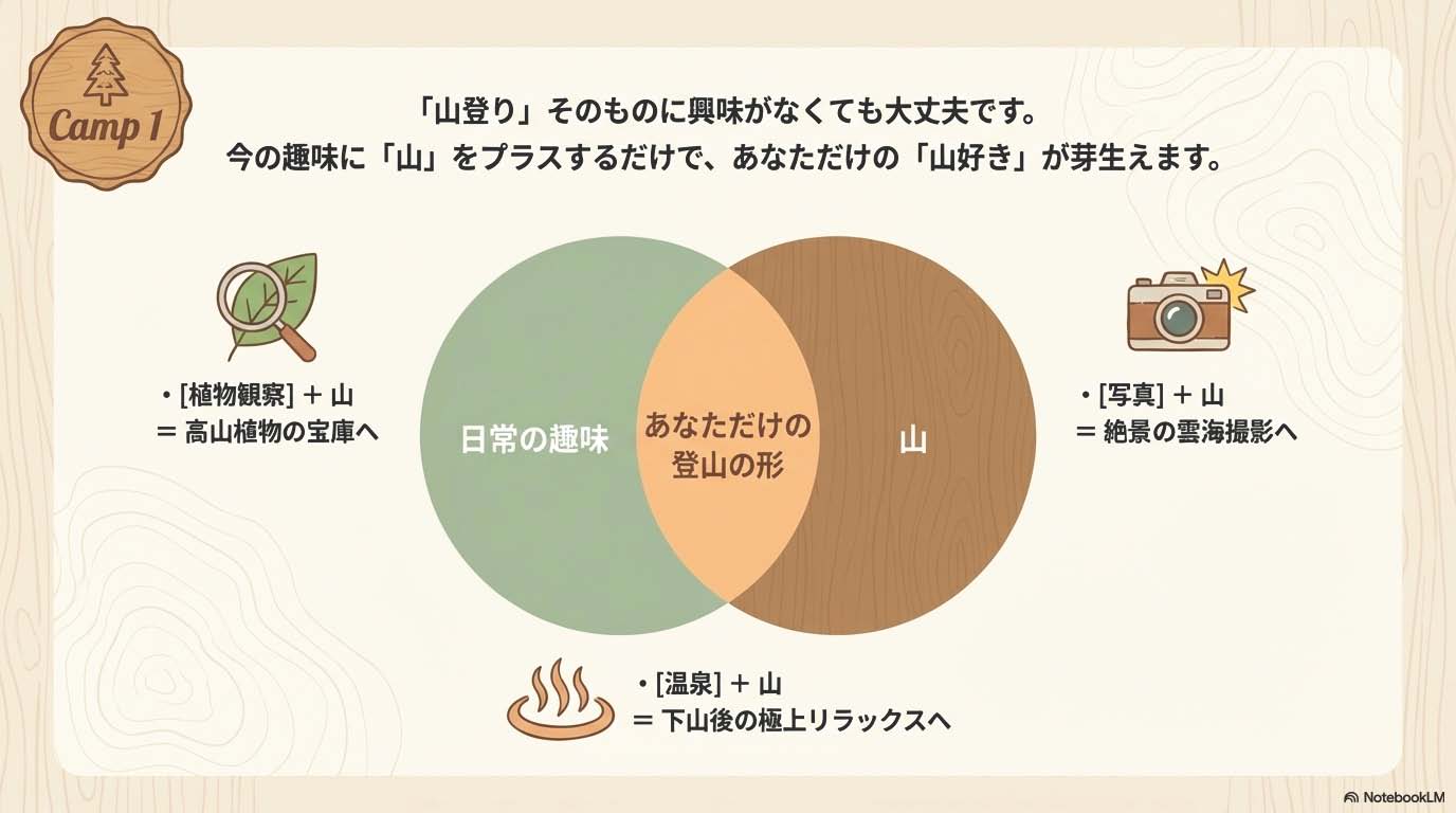 誰の心の中にも隠れている「山好き」な気持ちに気づき、「山に登ってみたい!」という思いを湧き上がらせることが登山の第一歩です。たとえば、植物観察など自分の元々の趣味と山を結びつけたり、普段何気なく通り過ぎている景色の中で足を止めて山を眺めてみたりすることで、興味が湧いてきます。海が好きな方であれば、マリンスポーツも楽しめる「島登山」もおすすめです。