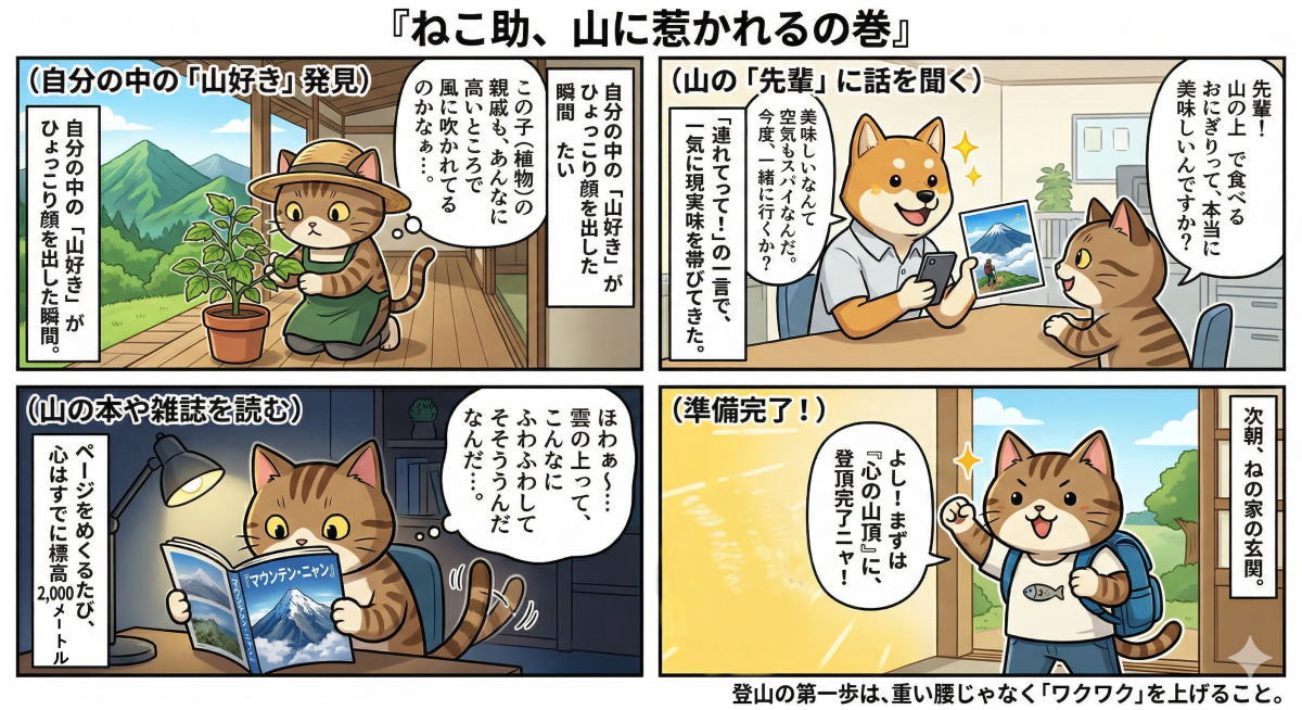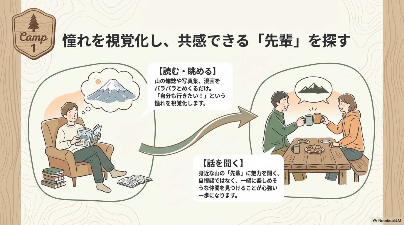 身近な職場の同僚や友人の中で山登りの経験がある「先輩」を見つけ、山の魅力について話を聞くのも良い方法です。「話を聞かせてほしい」「山に連れていってほしい」と頼めば、喜んで話してくれ、山に行く気も盛り上がります。ただし、自慢話ばかりする人ではなく、仲間として一緒に楽しめる人を選ぶのが理想的です。